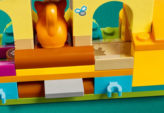 - Daudz piederumu. LEGO® komplektā ir ēdiens un ūdens, kaķu kastīte, kur, bērniem pavelkot sviru, kaķītis nokārtojas, birste, kastītes liekšķere un rotaļu zivs