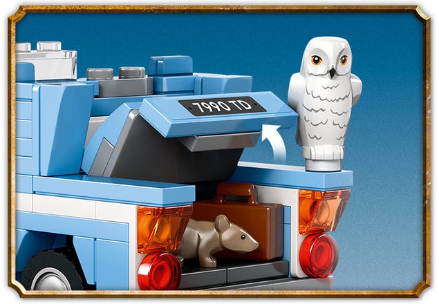 - Detalizēts Lidojošais Ford Anglia™ modelis: Ar atveramām durvīm, noņemamu jumtu un bagāžnieku, kurā var ievietot dažādu piederumus.