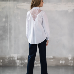 Skaista baltā blūze ar garām piedurknēm un dekoratīvām mežģīnēm priekšpusē.