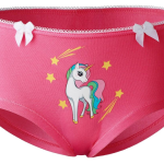 Meiteņu biksītes izgatavotas no mīksta elastīga kokvilnas auduma. Apmales ir no mīkstas gumijas. Kreiso pusi rotā sirds motīvs ar logotipu.